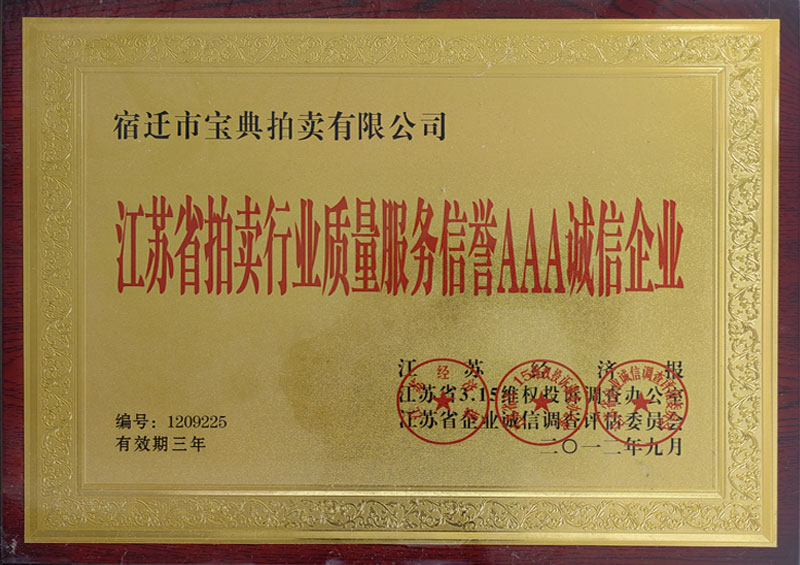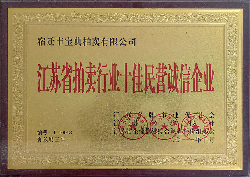 宿遷市寶典拍賣(mài)有限公司是由宿遷市經(jīng)貿(mào)委(現(xiàn)為市商務(wù)局)申辦、江蘇省經(jīng)貿(mào)委(現(xiàn)為省商務(wù)廳)批準(zhǔn)、宿遷市工商行政管理局(現(xiàn)為宿遷市市場(chǎng)監(jiān)督管理局)依法登記注冊(cè)設(shè)立的綜合性拍賣(mài)企業(yè)。 公司的經(jīng)營(yíng)范圍:國(guó)家法律、法規(guī)與政策允許的物品拍賣(mài)。其中包括:行政、司法、企事業(yè)單位及個(gè)人委托的閑置公物、罰沒(méi)物、無(wú)主物、房地產(chǎn)、企業(yè)產(chǎn)權(quán)、書(shū)畫(huà)藝術(shù)品、機(jī)動(dòng)車(chē)輛、無(wú)形資產(chǎn)等。